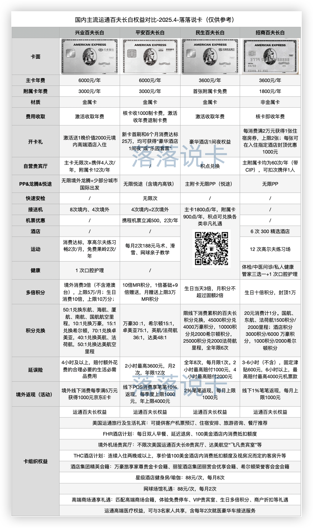 近期兴业百夫长白金卡上线,国内发行百夫长白金卡的银行达到五家。由于工行的百夫长白金卡在运通卡组织权益上有残缺,实际可供我们选择的百夫长白金卡只有四家。那么同为运通顶级卡,经典系列的百夫长和蓝盒子巅峰之家有何差异?四家银行的百夫长白金卡,我们该如何选择呢?今天落落为大家带来国内四大百夫长白金卡横向对比+选卡指南(2025版)。