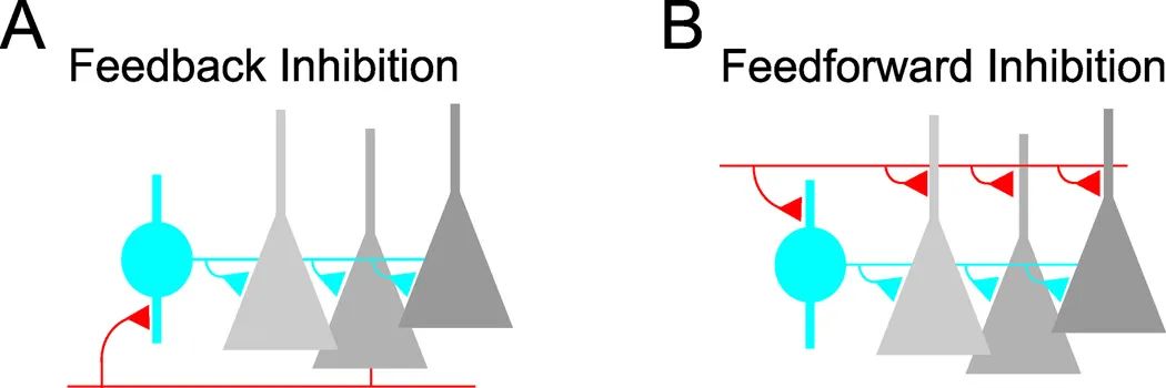 ▷图:右图,前馈抑制(feed-forward inhibition)是指,通过抑制拮抗通路的活动来加强当前通路的活动强度。也就是我在激活 A 的同时,抑制 B。左图,反馈抑制(feedback inhibition)则是机体为了避免激活强度过大或者激活持续时间过长,会在激活某一通路的同时,返回一个抑制信号,将激活水平维持在一定强度或控制激活的时长。也就是自己抑制自己。灰色为皮层主要细胞;红色为兴奋性突触;蓝色为抑制性突触。图源:Isaacson, Jeffry S., and Massimo Scanziani. "How inhibition shapes cortical activity." Neuron 72.2 (2011): 231-243.
