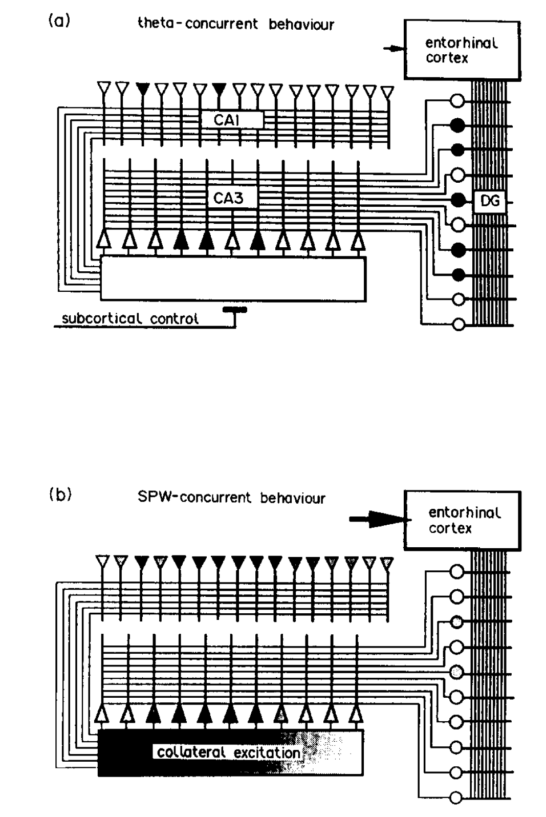 作为人工电刺激(artificial electric stimulation)实验发现的扩展,我总结道:“来自隔区(septum)的节律性躯体前馈抑制与来自内嗅皮层的远端树突兴奋同步到达,而高幅度场θ波*则是由协同活跃的源与汇*(sources and sinks)产生。”我承认,后续实验表明这一结论并不完全正确,但其基本原理依然成立。