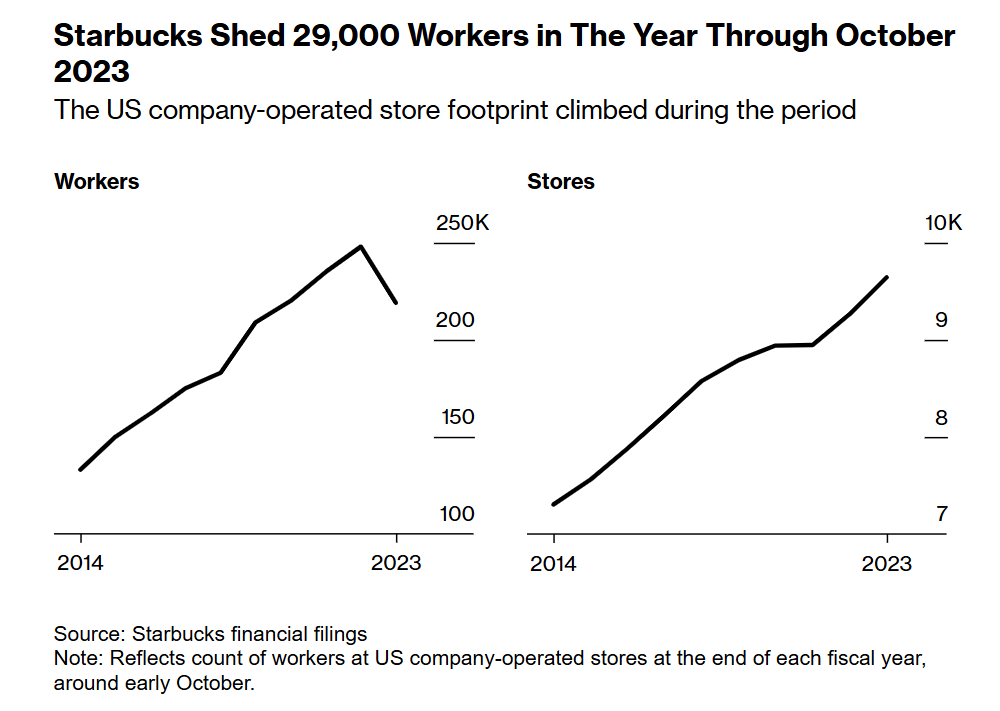 彼时的文件显示,截至2023年10月的一年里,星巴克新增了380家门店,但是在美国自营门店裁员2.9万人。