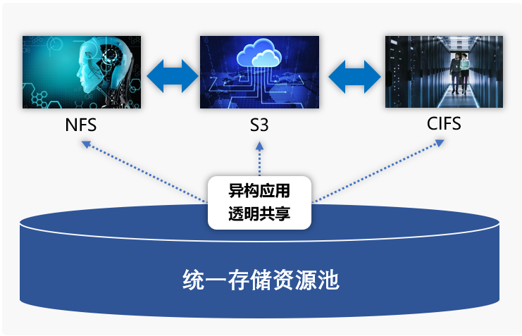 支持将云存储资源通过S3接入本地,并将其空间作为云端归档池,与本地存储池构建冷热分层存储,对外提供统一命名空间。用户的非敏感数据都可以存储到该分层存储池,在x-Archive的策略管理下,高频数据保存在本地实现高效访问,低频数据自动流动到云端,如数据需要被访问,可以自动从云端在线回调,实现云存储的无缝对接,构建经济立体的数据存储体系。