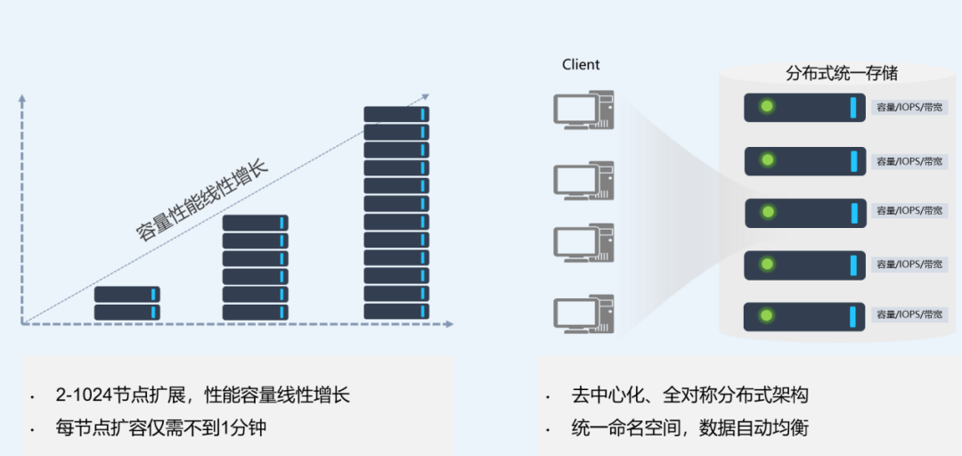 威努特分布式存储由多台独立的服务器实现,所有节点是完全对称架构,无主次之分,可以在不停机的情况下动态增加存储节点,实现存储容量和性能的动态扩展,“对称”意味着各节点可以完全对等,能极大地降低系统维护成本,且无单点故障。支持理论上无限水平扩展,支持EB级别的大规模存储。
