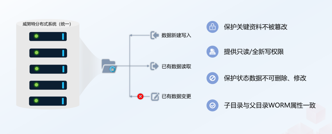 WORM(Write Once Read Many)是一次写入多次读取技术,即文件被写入完成后通过设置使其进入只读状态。在该状态下保护期内文件只能被读取,无法删除、修改或重命名。通过采用WORM技术对存储数据进行保护后,可以防止其因意外而修改,这就保证了企业或组织对一些重要的业务数据安全存储的要求。保护期内的文件,普通用户和有WORM操作权限的系统管理员都不可修改、删除或重命名。超过保护期的文件,用户和系统管理员不可修改或重命名,但可以删除。