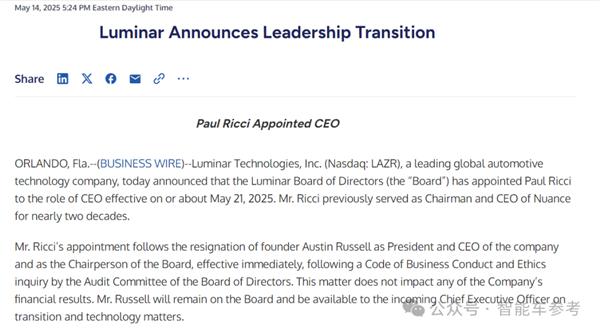 😮创始人离职:Luminar创始人奥斯汀·罗素因内部调查离职,辞去CEO等职务,引发行业关注。