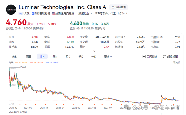 相比速腾、禾赛动辄几十万台的年出货规模,Luminar的交付数据就显得单薄很多。且越来越多全球OEM和Tier 1,正在选择中国激光雷达,留给Luminar的蛋糕已经不多了。也正是基于这种形势,Luminar还要面临来自投资者的压力。目前,Luminar市值为2.16亿美元(约15.6亿元),与年初相比股价已下跌约16%,过去一年下跌了83%左右。
