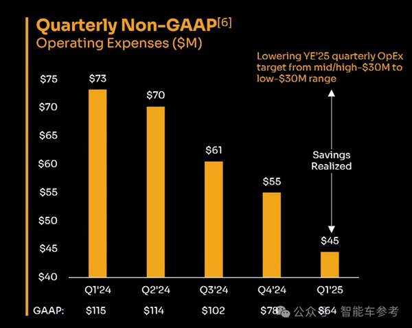取得这样的业绩成果,主要来自两方面提升。首先就是由出货量带动。Luminar在第一季度出货约6000个激光雷达,环比提升约50%。Luminar预计,到2025年末,公司激光雷达出货量将增长三倍,销售收入也将同比增长10%至20%。其次就是公司的降本措施初步取得了成效,具体包括裁掉约140名员工,并终止了部分承包商的合作等等。目前,公司一季度非GAAP营业费用下降到了4500万美元(约3.25亿元),同比减少38%。