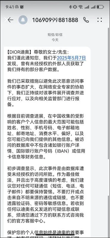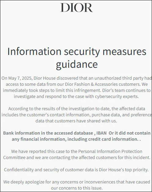 张贴在迪奥韩国店的通知还表明泄露日期为2025年5月7日。迪奥作为国际奢饰品品牌,毫无疑问这是一起具有国际影响的常见网络安全事件。但在这种情况下,只有联系信息、购买数据和客户与品牌共享的偏好被标记为潜在暴露信息。