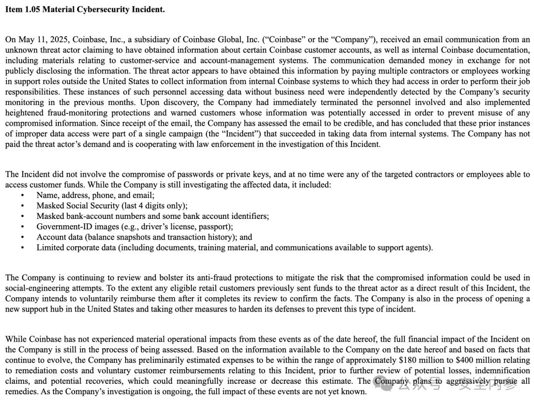 此次事件的财务影响仍在评估中,Coinbase尚未透露有多少客户在后续的社会工程攻击中被骗向攻击者转账。但公司估计,因补救措施和客户赔偿产生的总支出将在约1.8亿至4亿美元之间。