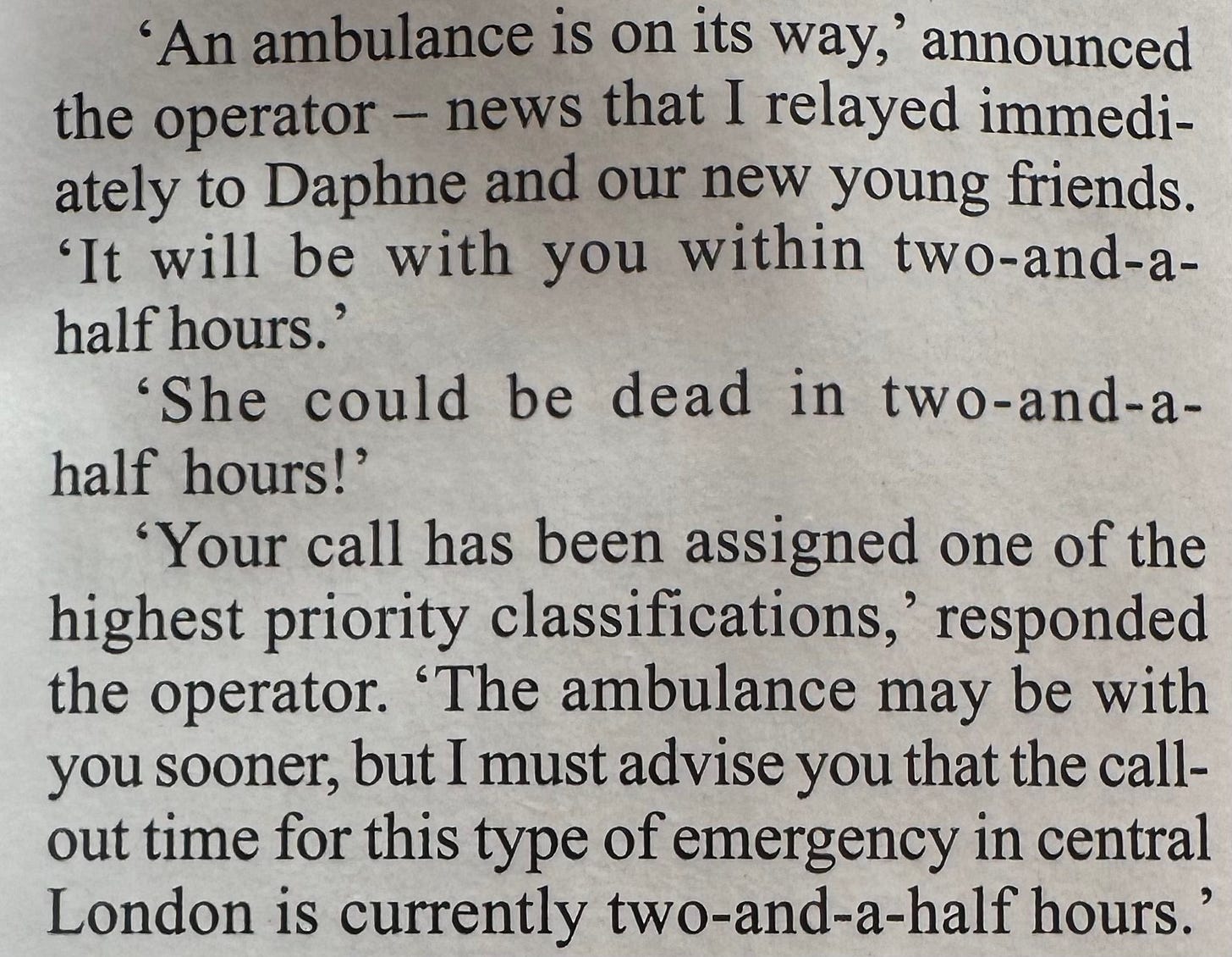 An old lady, Daphne, had fallen on the street, knocked her head, and was bleeding. I’d encourage you to read the whole thing, but I photographed an especially shocking passage in the print copy I was reading at the time.