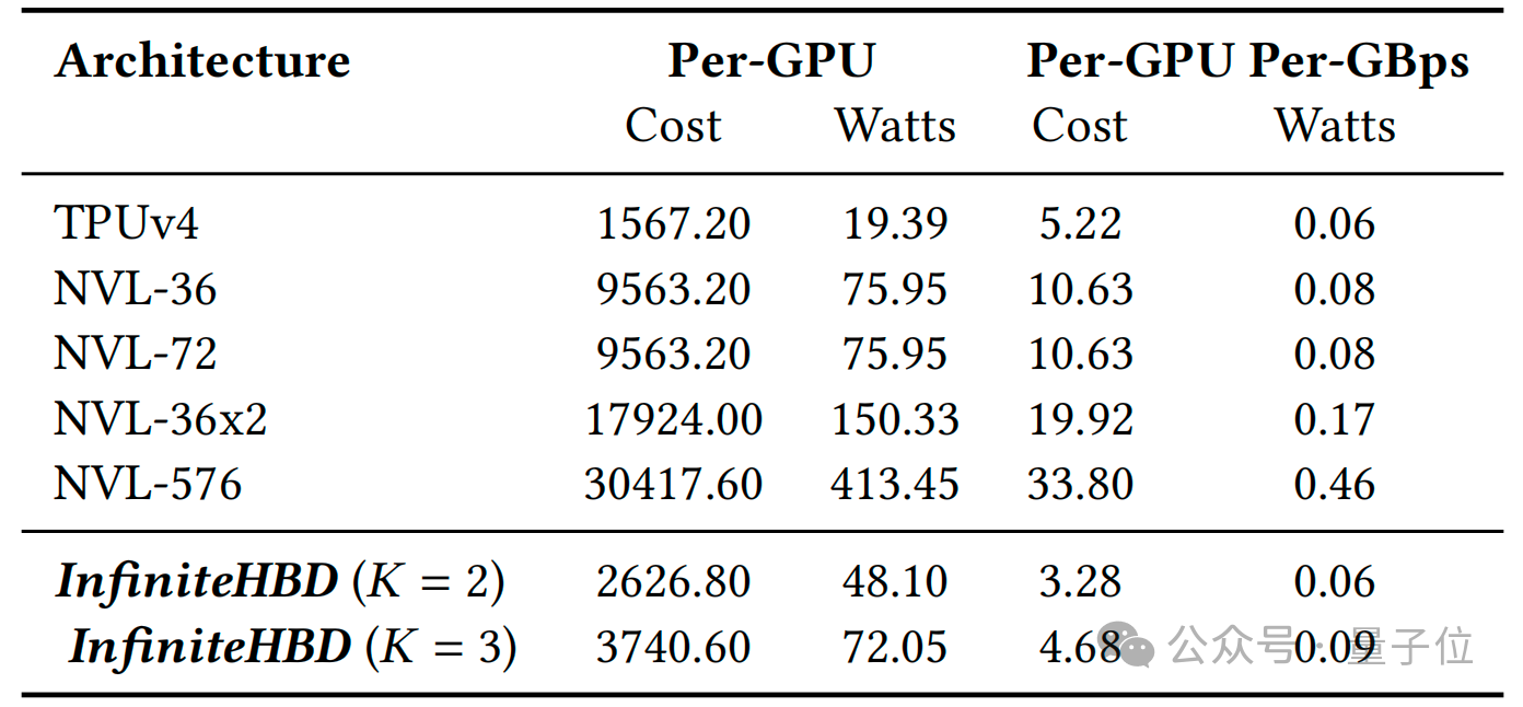 InfiniteHBD的单位成本仅为NVL-72的31%,GPU浪费率接近零(比NVL-72和TPUv4低一个数量级以上),且与NVIDIA DGX(每节点8个GPU)相比,MFU最高提升3.37 倍。