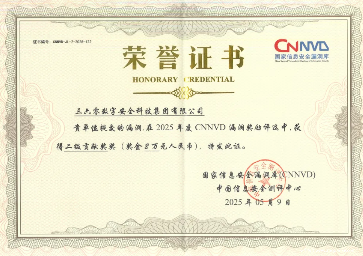 作为国内领先的数字安全企业,360数字安全集团长期深耕漏洞研究与风险处置领域,积累了雄厚的技术实力与丰富的实战经验。自与CNNVD开展合作以来,360数字安全集团持续为其输送高质量原创高中危漏洞,高效完成各项漏洞挖掘、漏洞处置、漏洞分析、漏洞响应任务,曾接连获得CNNVD“年度优秀技术支撑单位”、“最佳新秀奖”、“一级技术支撑单位”等表彰。