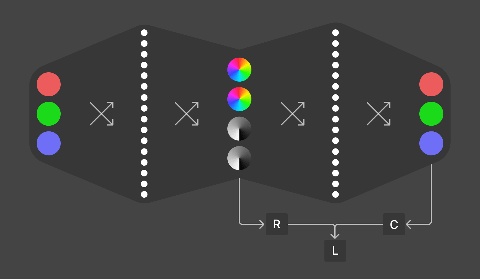We used a 2-layer MLP autoencoder with RGB colors (3 dimensions) as input and output, and a 4-dimensional bottleneck layer. While RGB data is inherently 3-dimensional, we needed a 4D bottleneck because of our unitarity (hypersphere) constraint, described below.