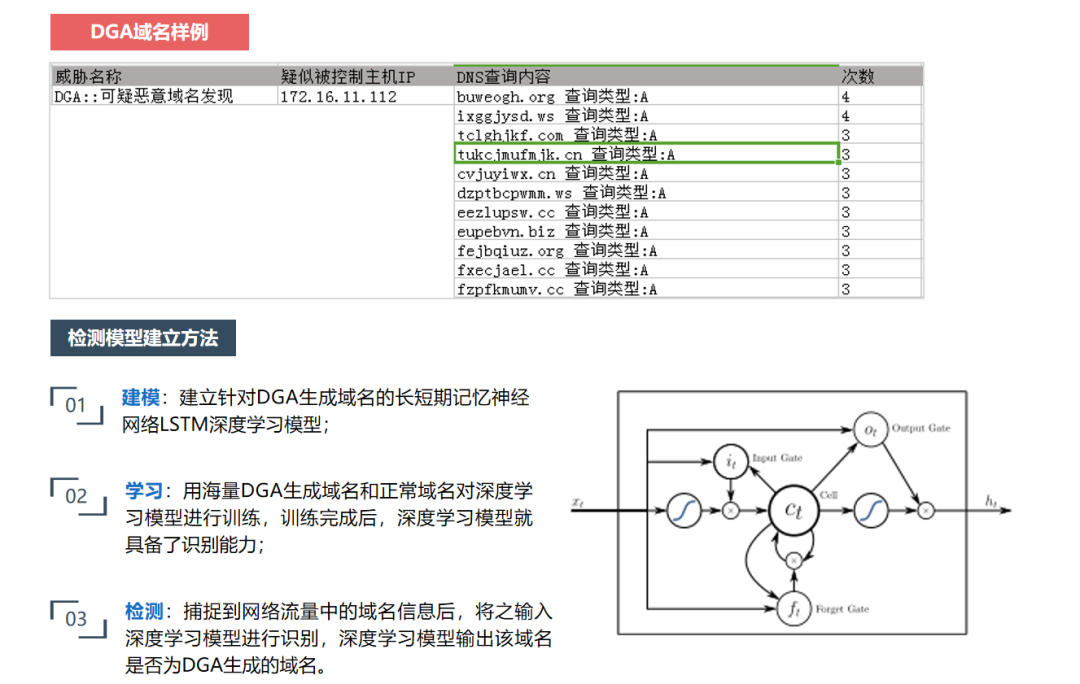 威努特高级威胁检测系统的DGA域名AI检测能力通过建立针对DGA生成域名的集成学习模型,用海量DGA生成域名和正常域名样本通过集成学习模型进行训练,使集成学习模型具备识别DGA域名能力。在捕捉到网络流量中的域名信息后,将之输入深度学习模型进行识别,集成学习模型输出该域名是否为DGA生成的域名,进而准确定位受控主机。