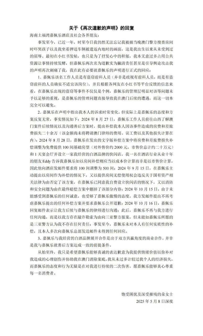 根据目前已公开信息也有看到,涉事方海南土福湾嘉佩乐度假酒店在事情发生后,也就是去年8月16日首次提出过赔偿方案,愿意提供3晚住宿来作为对朵女士的补偿,但朵女士拒绝,其核心诉求是要求酒店方协助消除澳门案底并赔偿损失。