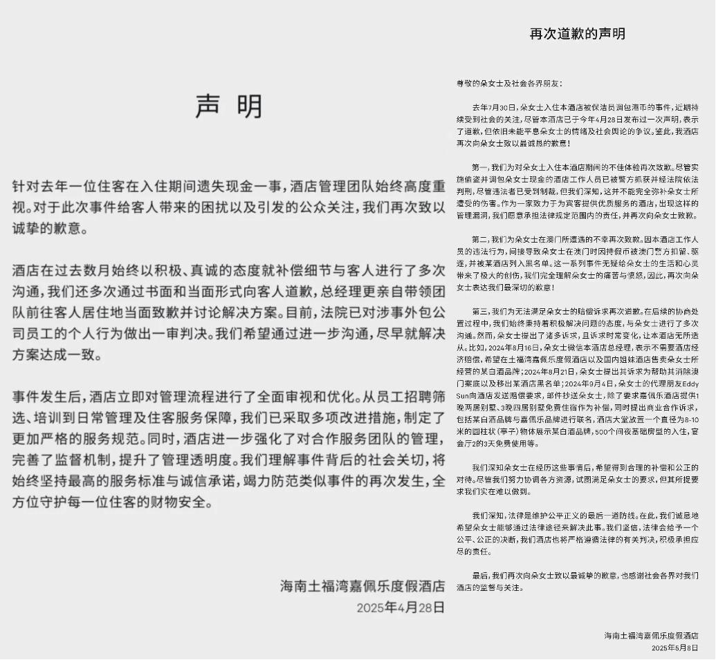 就在判决结果被披露不久后,海南土福湾嘉佩乐度假酒店先后发布了两封道歉信,表达对朵女士事件的歉意以及始终积极协商赔偿的态度,是朵女士的要求一直变,酒店方不能满足其诉求。
