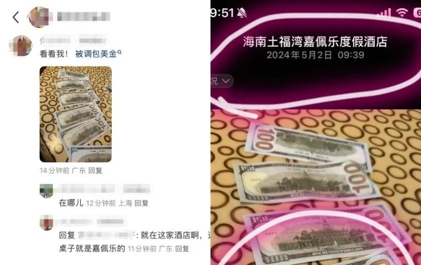 且有网友在朵女士帖文下也分享了自己住酒店被偷、丢东西的遭遇。有人去年就曾在朵女士入住的这家嘉佩乐酒店中被调包了美金。根据该网友提供的被调包美金照片,事发时间比朵女士还要早,是去年5月份,当时报警后这件事也并未得到解决。