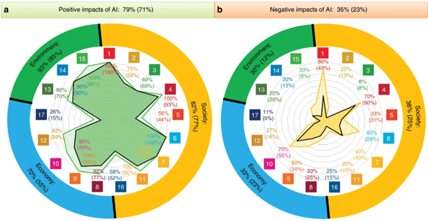图片来源:https://m.yicai.com/news/102177994.html首先,在“人工智能带来的收益和风险”部分,薛澜指出,2015年全世界193个国家共同签署了联合国可持续发展目标(SustainableDevelopmentGoals)。该目标包含社会、经济和环境三个维度,共包含17个目标以及169个具体指标。有研究表明,人工智能对134个(79%)具体目标产生积极的促进作用,也有可能对59个具体目标(35%)产生不利影响。