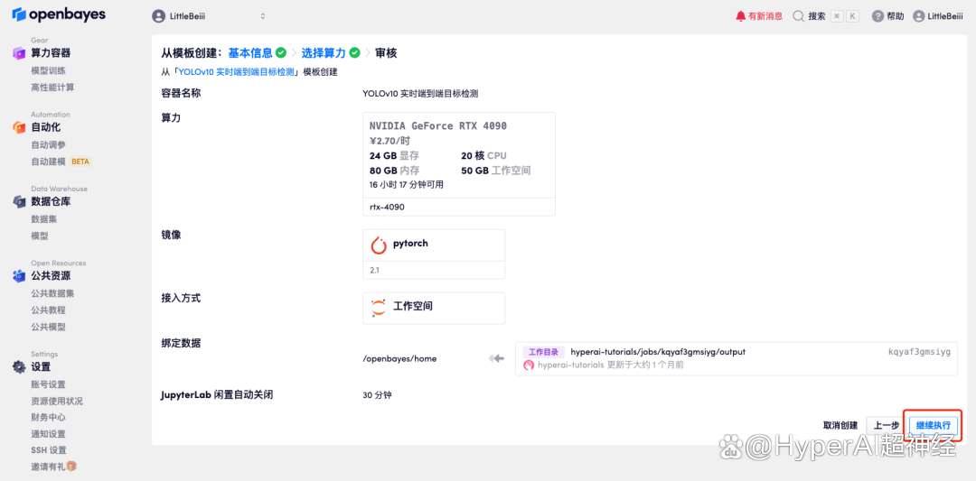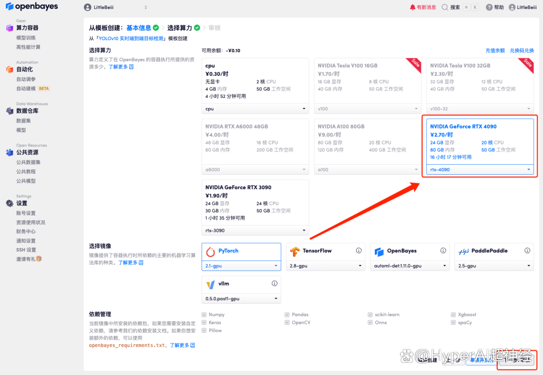 3. 点击右下角「下一步:选择算力」。 4. 页面跳转后,选择「NVIDIA GeForce RTX 4090」,点击「下一步:审核」。新用户使用下方邀请链接注册,可获得 4 小时 RTX 4090 + 5 小时 CPU 的免费时长!