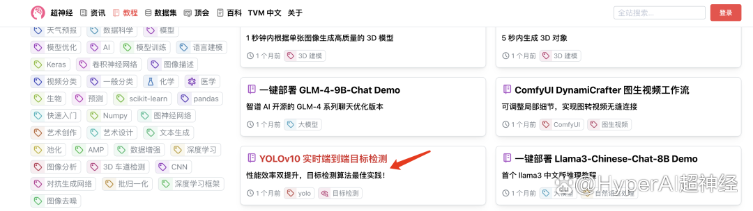 过去几年中,由于 YOLO 在计算成本和检测性能之间的有效平衡,它已经成为实时目标检测领域的主要范式。然而,YOLO 依赖于非极大值抑制 (NMS) 进行后处理,这阻碍了 YOLO 的端到端部署,并对推理延迟产生了不利影响。 YOLOv10 是由清华大学研究人员基于 Ultralytics Python 包开发的实时目标检测方法,旨在解决之前 YOLO 版本在后处理和模型架构方面的不足。通过消除非最大抑制 (NMS) 并优化各种模型组件,YOLOv10 在显著降低计算开销的同时实现了最先进的性能。 HyperAI超神经官网现已上线了「YOLOv10 实时端到端目标检测」教程,无需输入任何命令,一键克隆即可立即开启目标检测。 教程地址: https://go.hyper.ai/QuINA Demo 运行 1. 登录 hyper.ai,在「教程」页面,选择「YOLOv10 实时端到端目标检测」,点击「在线运行此教程」。 2. 页面跳转后,点击右上角「克隆」,将该教程克隆至自己的容器中。