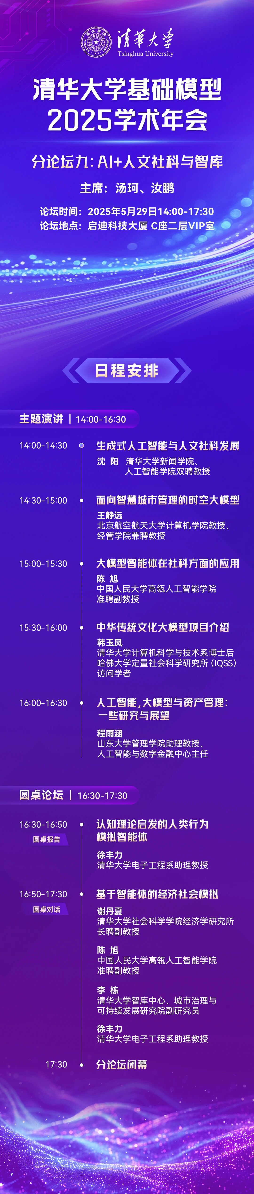 本分论坛将聚焦“AI + 人文社科与智库”,围绕基础模型在跨学科领域的前沿应用展开研讨。主题演讲涵盖生成式人工智能对人文社科研究范式的影响、时空大模型在智慧城市管理中的创新实践、大模型驱动的社会模拟技术探索、中华传统文化大模型项目的建设路径,以及大模型给资产管理带来的冲击与改革方向。圆桌论坛以“基于智能体的经济社会模拟”为议题,深入探讨智能体技术在经济社会系统建模中的关键问题。会议旨在搭建学术交流平台,推动 AI 技术与人文社科研究、智库建设的深度融合,为相关领域的理论创新与实践发展提供新思路。