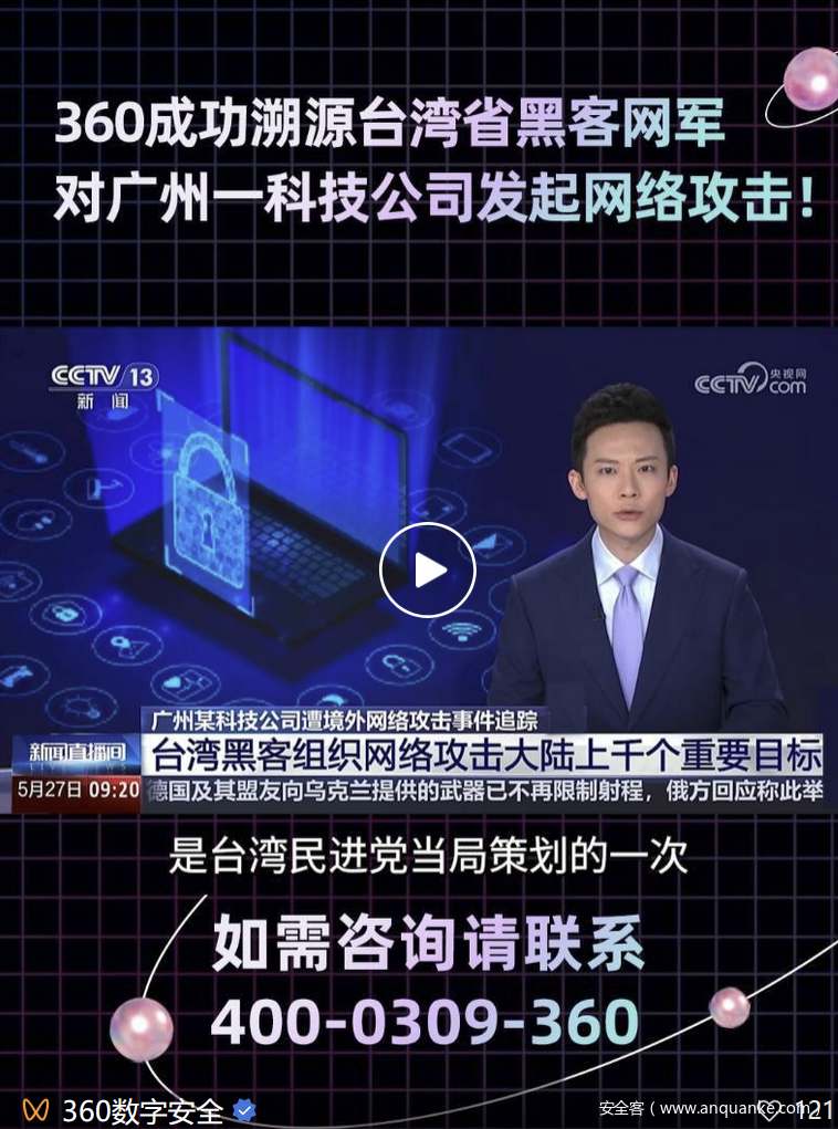 近日,广州市公安局天河区分局发布《警情通报》称,此前境外黑客对我某科技公司进行网络攻击案件,经国家相关部门和360等安全机构专家技术分析和溯源追踪,初步查明该公司遭受的网络攻击系中国台湾民进党当局豢养的黑客组织所为。