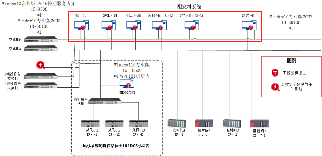 3、在配发料系统的服务器、操作站等主机上部署工控主机卫士,实现对生产环境内的主机安全加固。保障主机的运行安全,避免恶意代码对主机造成破坏并恶意扩散;如下图所示: