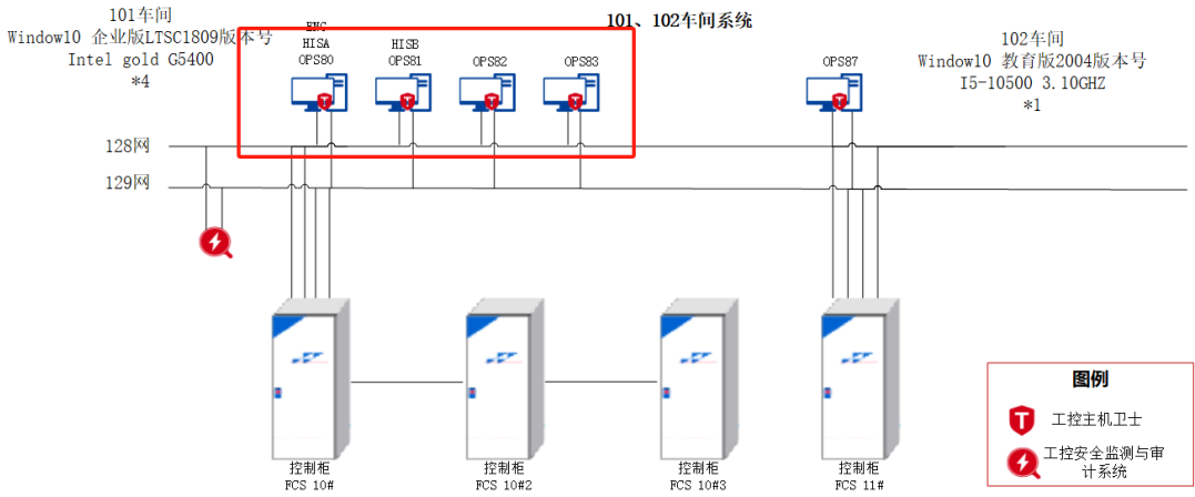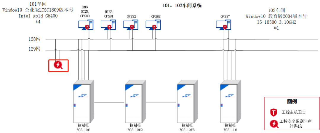 2、在101和102的服务器、操作站等主机上部署工控主机卫士,实现对生产环境内的主机安全加固。保障主机的运行安全,避免恶意代码对主机造成破坏并恶意扩散;如下图所示: