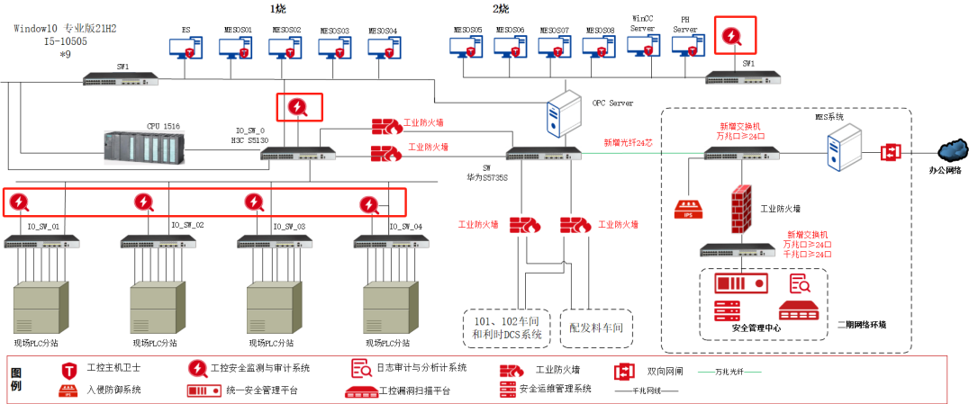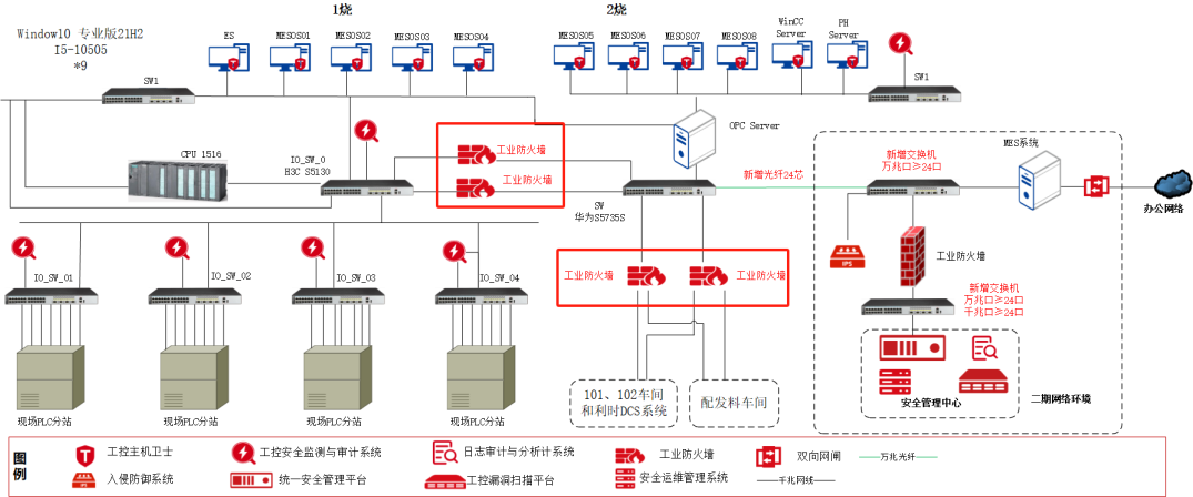 在各车间到2烧中控室核心交换机的链路上部署工业防火墙实现各车间之间的逻辑隔离,避免各区域内部存在的威胁通过核心交换机横向扩散,减少风险对其他业务系统的威胁。