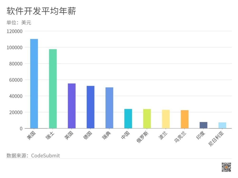 印度程序员的工资也很低,印度软件开发者的年薪只相当于美国同行的7%,中国同行的32%。