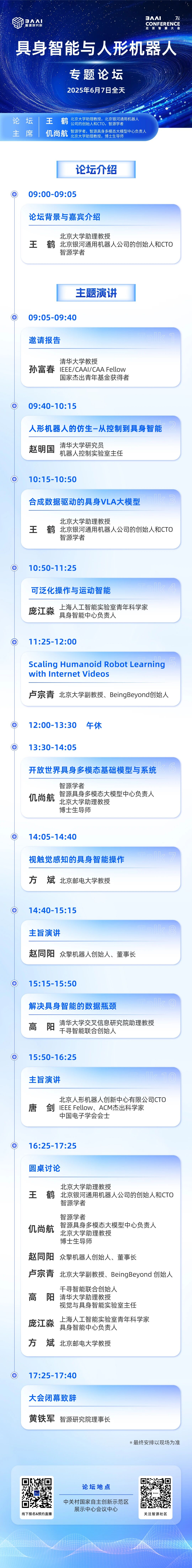卢宗青现任北京大学计算机学院长聘副教授,国家级青年人才,智源学者。主要研究强化学习、多模态大模型、通用智能体,担任ICML、NeurIPS、ICLR领域主席。6、开放世界具身多模态基础模型与系统仉尚航,智源学者,智源具身多模态大模型中心负责人,北京大学助理教授北京邮电大学“拔尖人才”教授,主要研究方向机器人智能感知、交互与操作。兼任中国人工智能学会认知系统与信息处理专委会秘书长,中国人工智能学会杰出会员, 中国计算机学会智能机器人专委会常务委员,IEEE 高级会员。发表Nature Communications、IEEE TRO、Soft Robotics等高水平期刊及ICRA等会议论文上百篇,出版中英文专著各1部,获得国际会议/国际期刊最佳论文奖8项,包括机器人领域顶会ICRA2021最佳论文提名奖、ICARM2021最佳论文奖、ROBIO2019最佳学生论文奖等。作为首席客座主编在多个SCI国际期刊组织了机器人灵巧操作的专刊。多次带领学生在国际IROS抓取操作比赛中获得冠军,曾被清华大学评为挑战杯“优秀指导教师”。研制的触感灵巧手入选了国家“十三五”科技创新成就展,开发的咽拭子自主采集机器人系统获得了国际日内瓦发明展银奖。同时获得了IEEE仿生机电及机器人技术委员会“早期职业生涯奖”、中国指挥控制学会“青年科学家奖”、北京市“创新大工匠”,中国自动化学会自然科学奖一等奖等。赵同阳,连续创业者,在机器人领域深耕十年。从2016年就开始投身机器人行业,2023年成立,成立众擎机器人。24年10月推出全尺寸人形机器人SE01。高阳,千寻智能联合创始人,清华大学助理教授、视觉与具身智能实验室主任高阳,清华大学交叉信息研究院助理教授,千寻智能联合创始人。主要研究计算机视觉与机器人学。此前,他在美国加州大学伯克利分校获得博士学位,师从Trevor Darrell教授。他还在加州伯克利大学与Pieter Abbeel等人合作完成了博士后工作。在此之前,高阳从清华大学计算机系毕业,与朱军教授在贝叶斯推理方面开展了研究工作。他在2011-2012年在谷歌研究院进行了自然语言处理相关的研究工作、2016年在谷歌自动驾驶部门Waymo的相机感知团队工作,在2018年与Vladlen Koltun博士在英特尔研究院在端到端自动驾驶方面进行了研究工作。高阳在人工智能顶级会议NeurIPS,ICML,CVPR,ECCV,ICLR等发表过多篇学术论文,谷歌学术引用量超过5000次。王 鹤丨北京大学助理教授,北京银河通用机器人公司的创始人和CTO,智源学者