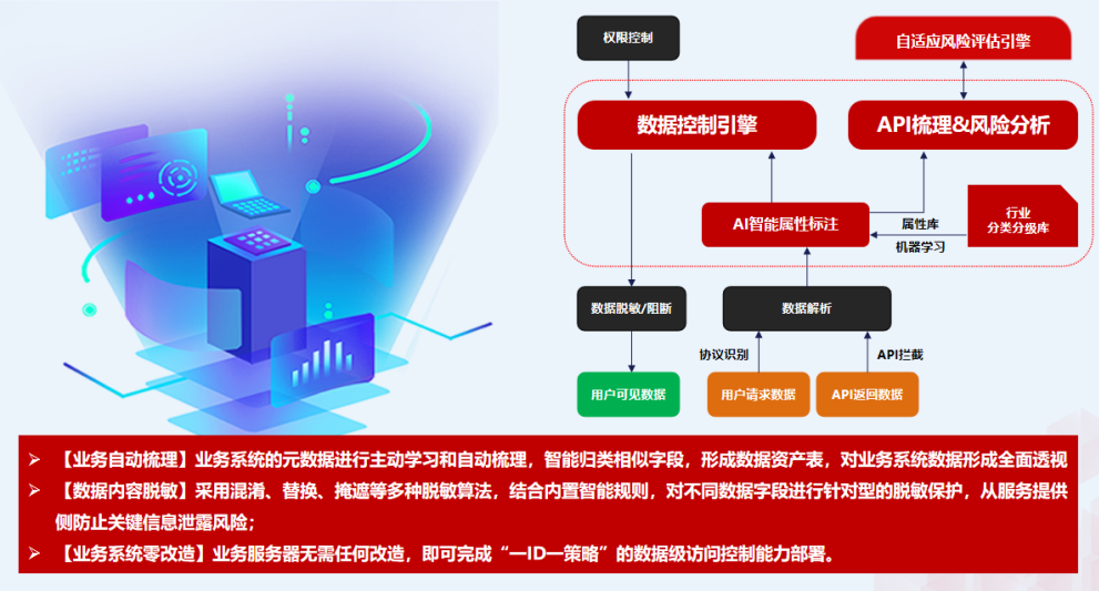 威努特数据安全统一管理平台具有API级、API数据级、业务用户级等更精细的管控粒度,同时具有无需业务进行任何改造即可实现数据级防护的特点。具备API自动采集分析、自动跟踪API变化、属性可视化呈现、自动标注,以及新增API/字段的预处理策略、符合国家规范的分类分级规则,可为用户提供尽可能便捷、安全、可视的业务使用体验。