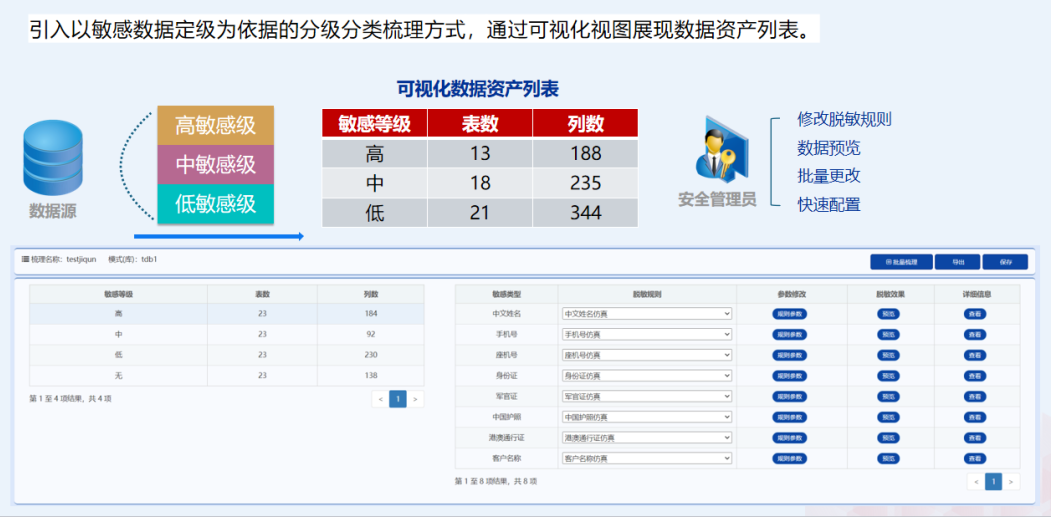 根据系统内置的敏感等级以及不同敏感等级的脱敏规则标准,可将已识别列的敏感类型进行分级分类梳理,且通过可视化视图展现。对敏感类型识别不准确的列,可以手动修改脱敏规则,进行脱敏前的数据预览,还可以通过列名等查询条件精确匹配模式,达到批量更改敏感类型效果。可从容应对万张表以上的敏感数据梳理,快速完成全库全量数据的脱敏任务配置,降低用户在数据脱敏使用过程中对于专业人员的依赖。