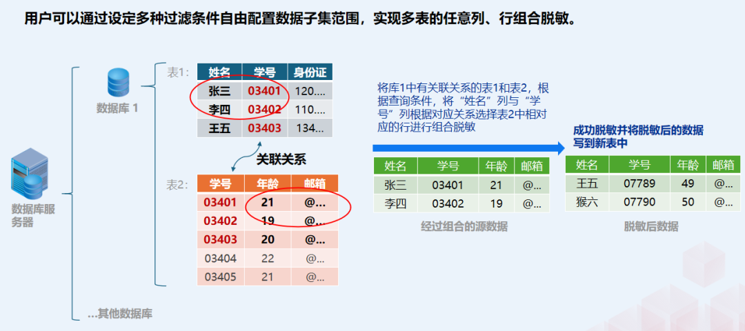 支持用户自定义不同范围的脱敏方案。能够对需要脱敏的数据范围进行自由选择,提供库级、表级、列级、行级的多种层次的范围设置。在单个表的字段进行组合查询后的数据脱敏的基础上,提供了数据子集配置,通过表与表之间的主外键关联关系,能够对多个表的任意列进行组合脱敏,满足用户不同场景下的脱敏需求。