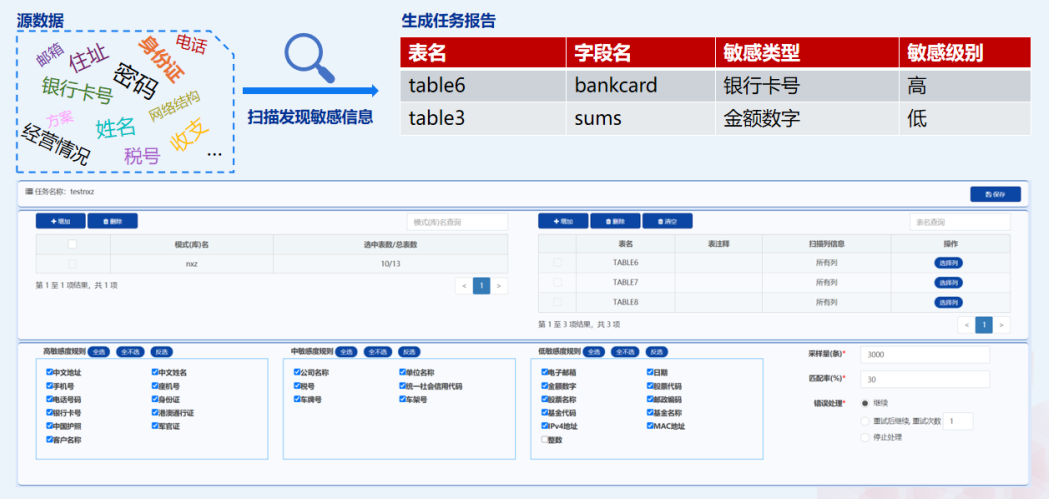 为识别敏感数据,系统支持自动对数据库和文件的内容进行扫描识别,提取样本数据后经过内置算法识别、检测发现敏感数据特征,并记录敏感数据所在的表、列以及敏感的类型,从而能够动态发现敏感数据分布。通过系统内置的近百种敏感数据发现规则,能够涵盖:电力、金融、公安、社保、工商、税务等多个行业的数据特征识别要求,并根据客户需求对敏感类型进行定级处理。灵活满足不同类型的数据在各个应用系统中的不同敏感度程度的识别要求。