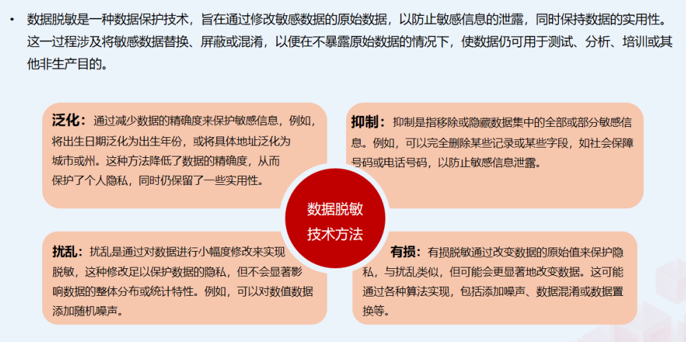 静态脱敏通常使用替换、无效化、乱序和对称加密等方法,将敏感数据替换为伪随机数据或固定的占位符。这些数据通常与原始数据保持相同的长度和格式,从而保留数据库结构和模式的完整性,同时隐藏原始数据的敏感信息。静态脱敏是一种永久性的脱敏处理,一旦完成就无法逆转。在选择脱敏方法时,应根据具体场景和数据类型进行权衡,以确保数据的可用性、完整性和准确性不受影响。