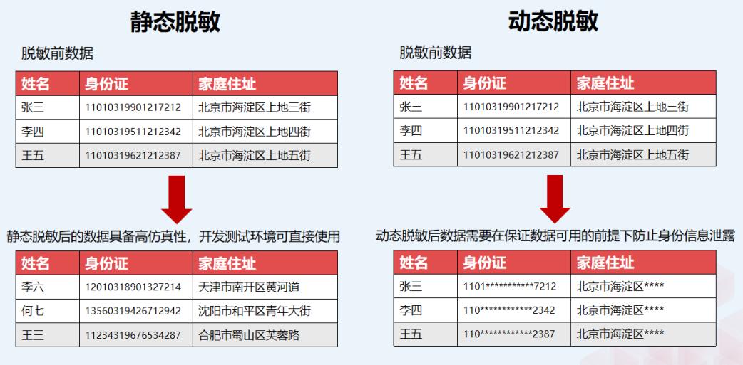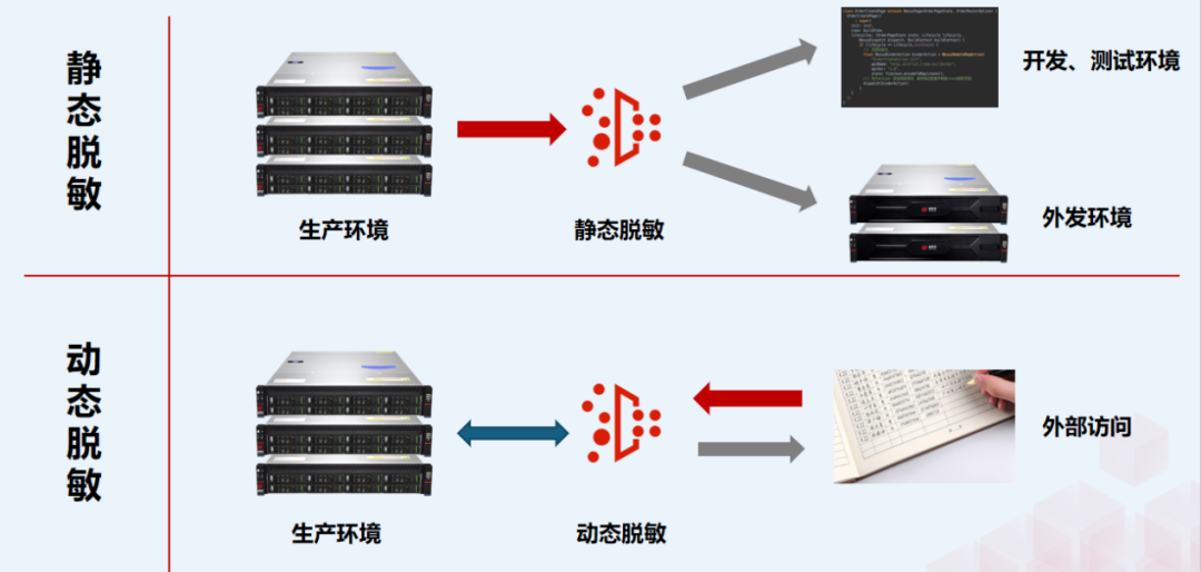 静态数据脱敏与动态数据脱敏是按脱敏数据的使用场景来区分的。所谓的数据使用环境,主要是指业务系统脱敏之后的数据在哪些环境中使用,一般可分为生产环境和非生产环境(开发、测试、外包、数据分析等)。