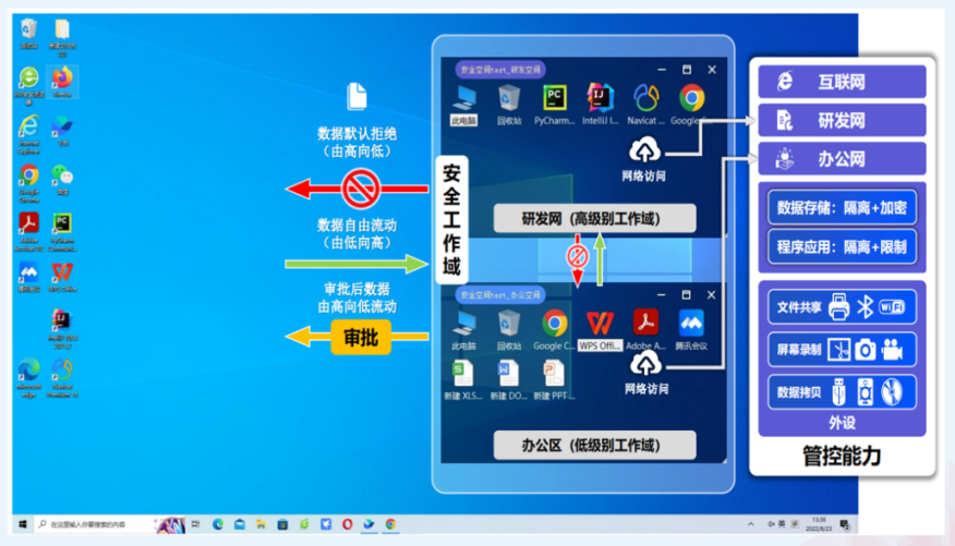 针对高敏感级别文件的传输,可在终端上安装威努特终端微隔离沙箱,通过下一代沙箱技术,在终端上构建独立的、隔离的安全工作空间,对于访问敏感数据的应用系统时,进行网络和数据拦截,实现敏感数据不落宿主机,防止数据泄漏。当应用在安全工作空间内运行时,应用的一切文件操作行为,都会被安全工作空间的管理驱动和重定向引擎所接管,重定向至不可见空间,保证了不可见空间数据与个人可见空间数据的隔离以及数据安全性。