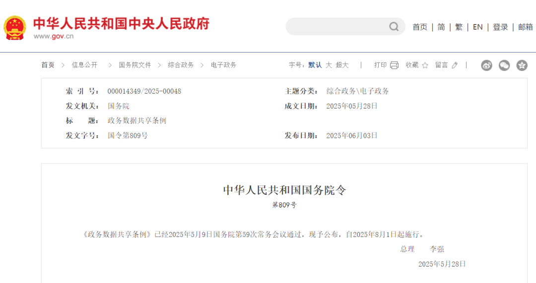 2025年6月3日,国务院发布第809号令,正式公布《政务数据共享条例》(以下简称《条例》),将于2025年8月1日正式施行。作为我国首部政务数据共享领域的行政法规,其以“安全有序高效共享”为核心目标,标志着数字政府建设迈入法治化深水区,为破解数据孤岛、释放政务数据价值提供制度利刃。