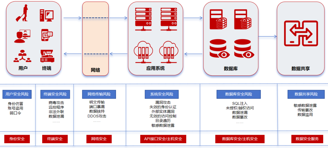 因此,基于数据流转的全生命周期进行数据安全防护成为必要手段。威努特参考零信任体系架构设计解决思路,分析政务数据在数据流转的各个阶段可能发生的风险,首先进行数据安全风险评估,从终端到网络,再到应用系统与数据库,总结归纳每一个阶段下存在哪些具体的问题,并据此凝练出相应的功能组件。