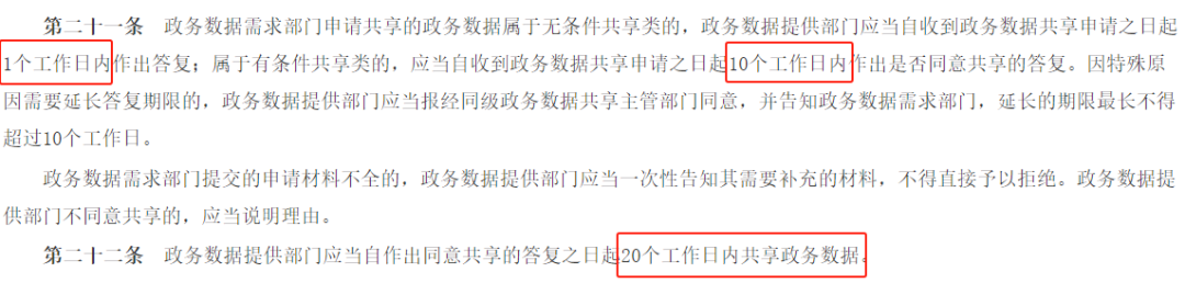 无条件共享数据1个工作日内答复;有条件共享数据10个工作日内答复;数据提供限时20日。这将有效根治数据共享的拖沓现状,提升行政效能。
