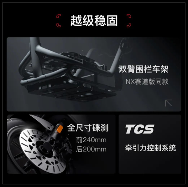 🛡️ **安全配置,放心骑行**:小牛NX Play配备NX赛道版同款的双臂围栏车架,前240mm、后200mm全尺寸碟刹和TCS牵引力控制系统,尽可能保证骑行安全。