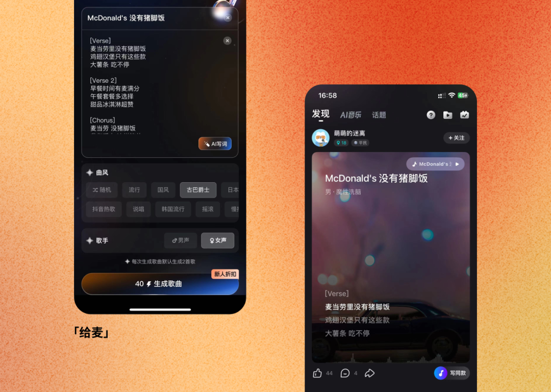 一些社交娱乐平台如“唱鸭”、“给麦”,在现有的音乐、游戏、直播功能基础上,引入了AI歌曲发布作为一个新的互动方式。
