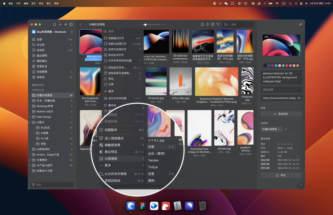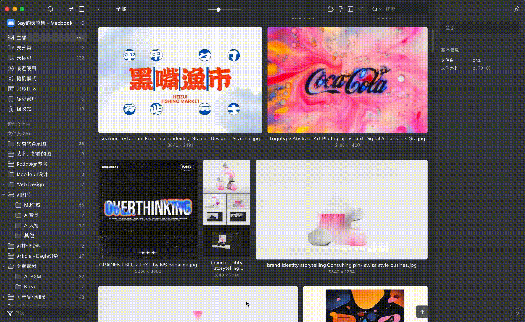 作为设计师,我们都会长期关注Pinterest、Behance等知名设计网站,在上面收藏大量灵感图像。Eagle的"批量保存"功能让我得以将过去在不同平台收藏的大量素材聚合归档。只需几步操作,就能将这些分散在各处的珍贵素材统统导入Eagle。这不仅节省了大量的素材归档时间,更让我们能对素材做到随手可查、快速调用,为日常设计、创作提供更丰富的灵感来源。批量保存Midjourney Alpha官网中收藏的图片丝滑的素材管理