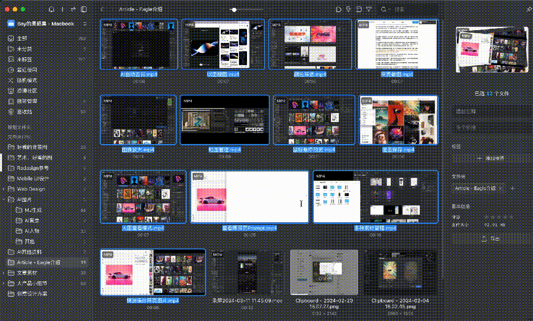 除了AI生成的图片和视频素材管理,我还将通过文件夹管理的产品案例截图、视频在Eagle中进行管理。网页截图