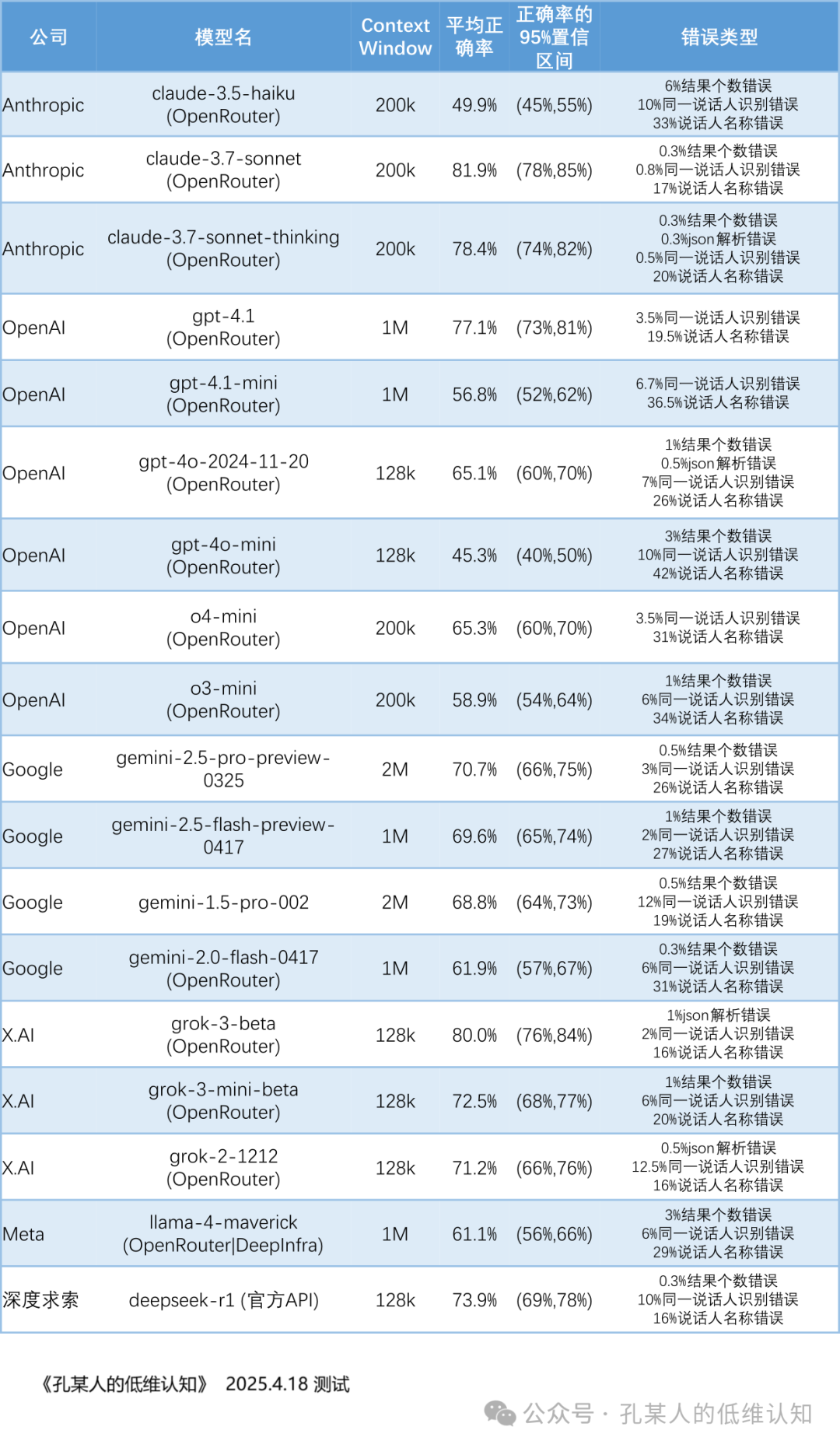 测试任务是:输入一个长播客的转录文稿,然后根据播客简介和转录内容,识别每个说话人各是谁、以及哪些ASR结果的说话人实际上是同一个。平均输出长度25.8k token(以gpt-4o的tokenizer计算),长度的标准差12.4k token。