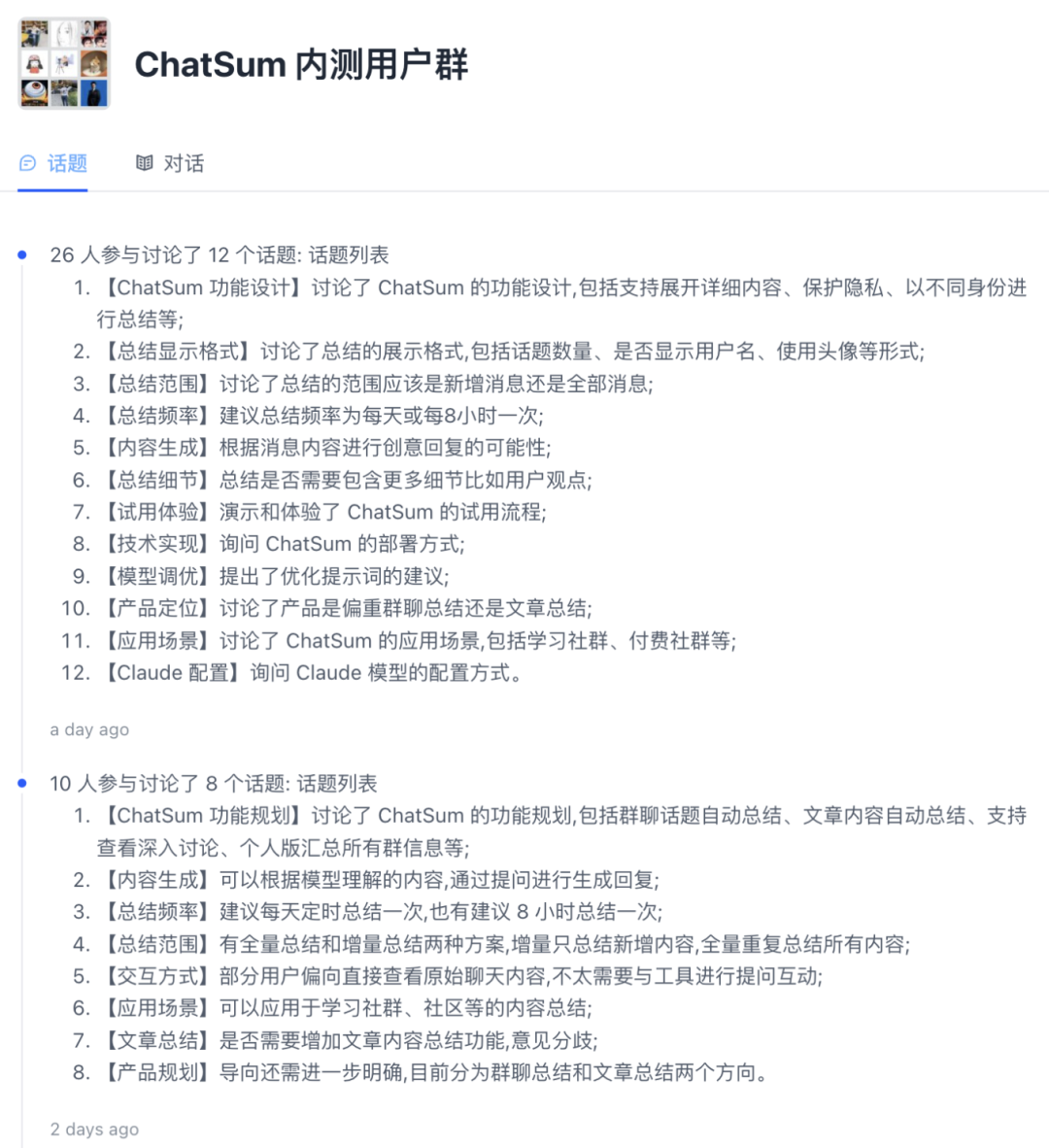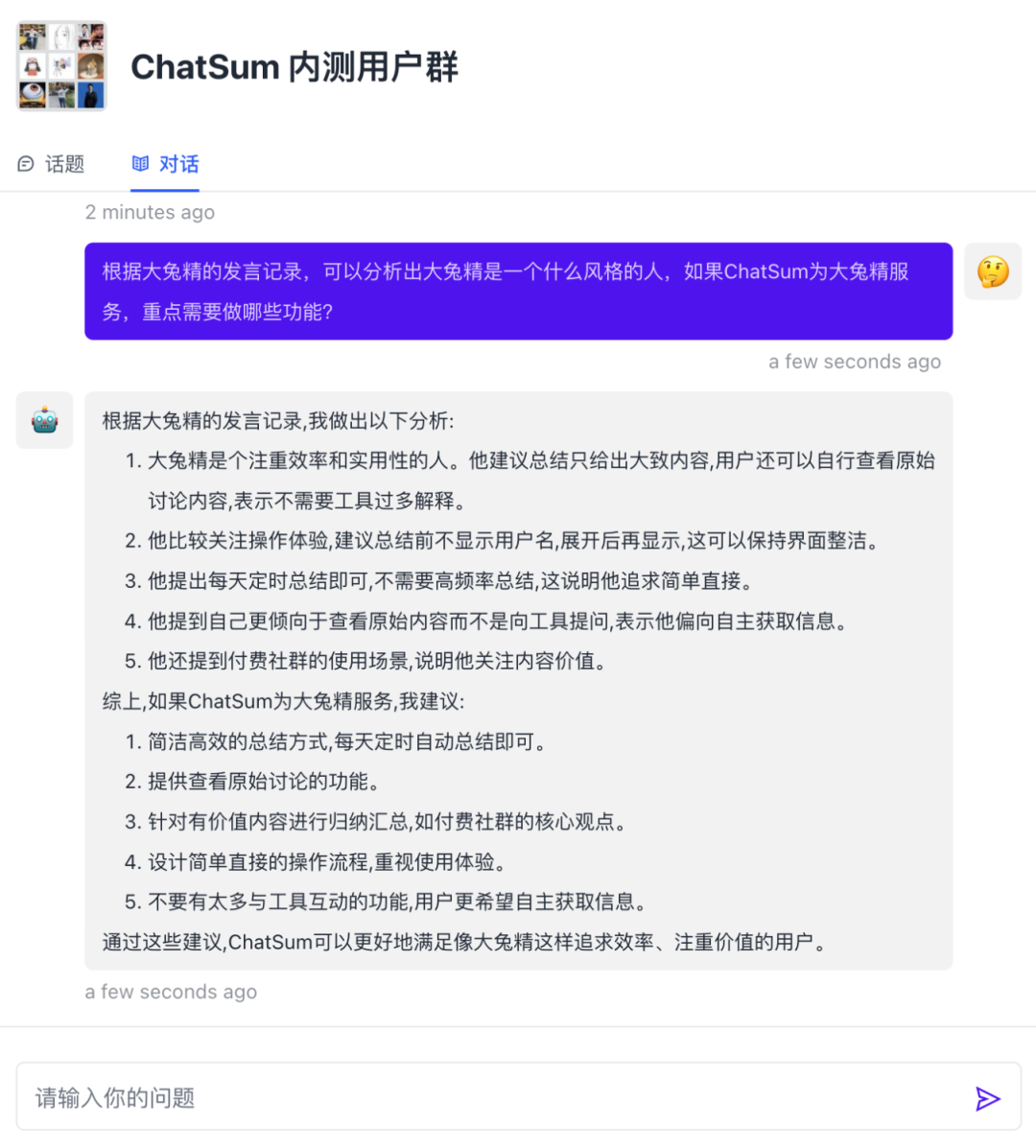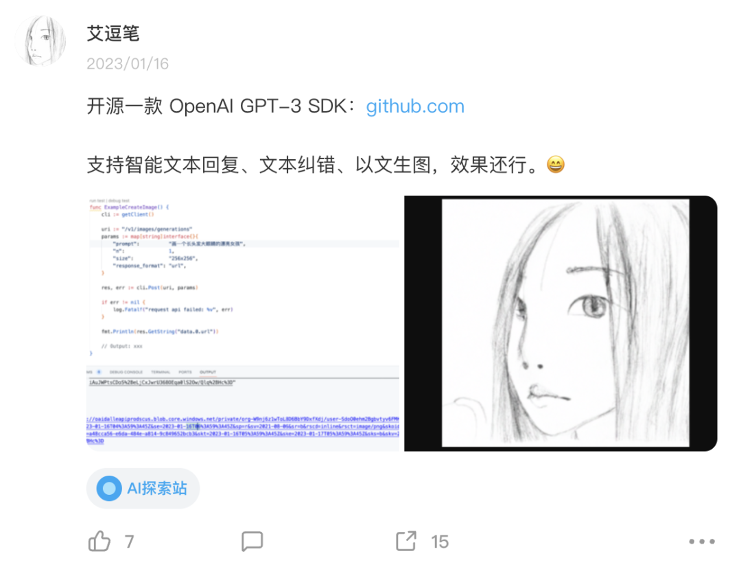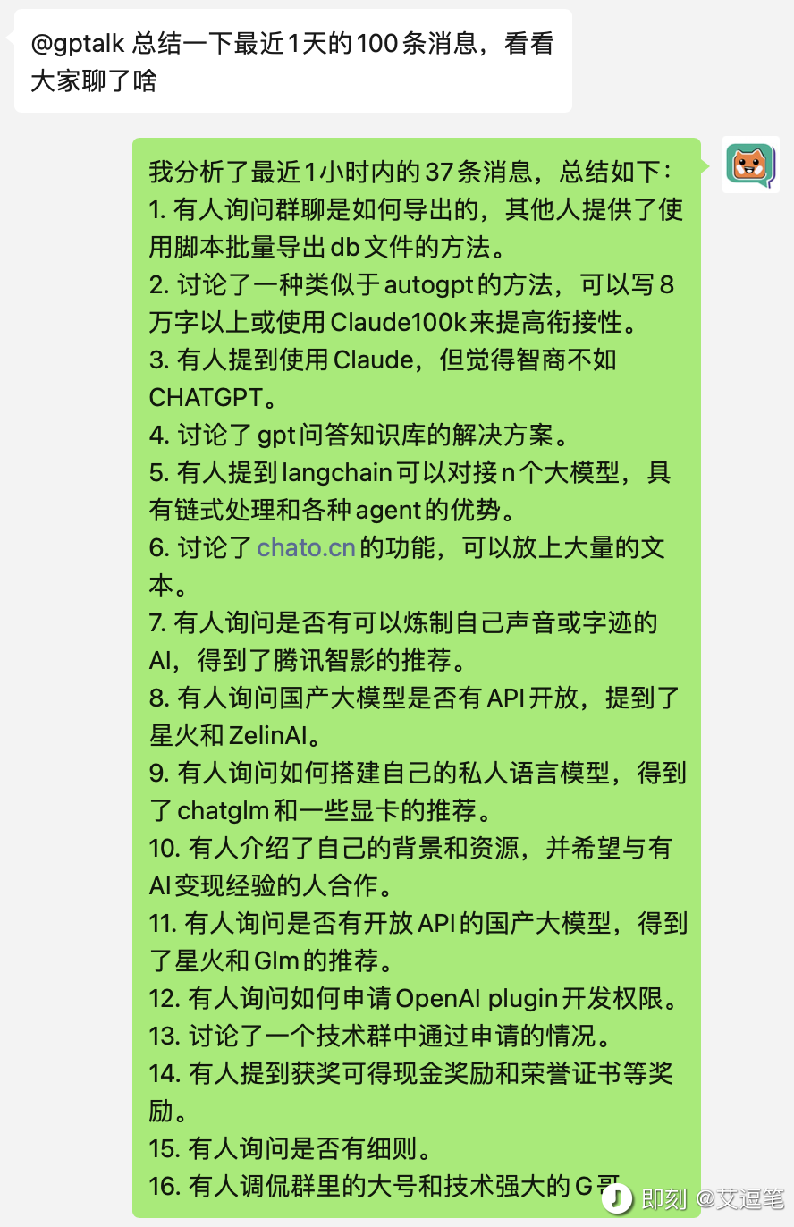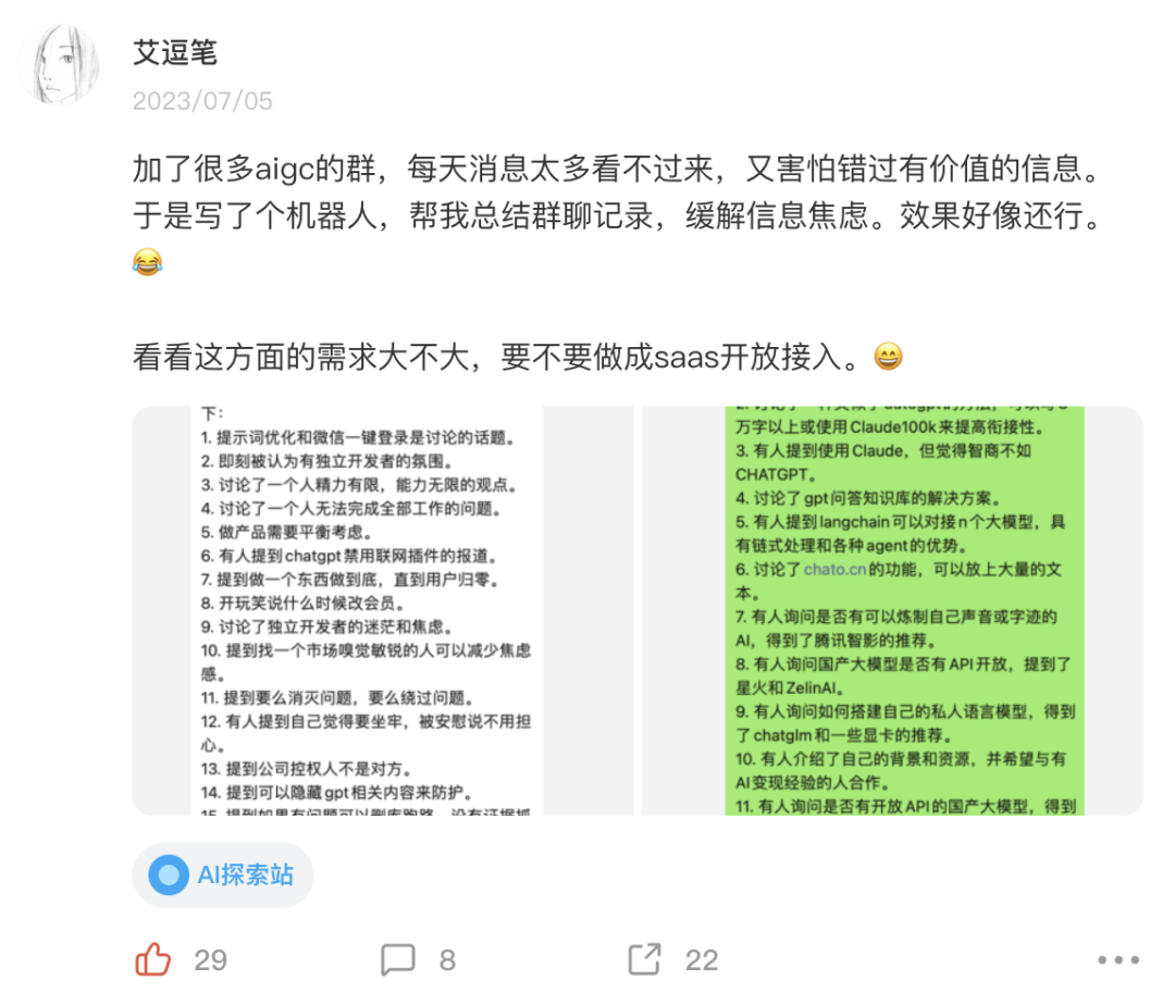 我在即刻社区发布了这个 SDK👇20240104110640这个 SDK 在 Github 累计收获 140 多个 star,后来 OpenAI 加了 cloudflare 验证,风控策略越来越严格,对抗了几次,模拟登录越来越难,只能放弃。模拟登录不上,这个 SDK 也就失去了使用价值。我第一次使用 AI 画图开源完 ChatGPT 模拟登录 SDK 之后,我研究了一下 OpenAI 的开放平台,看到 OpenAI 开放了 GPT-3 相关的 API,其中也有图像生成的接口。于是我又写了一个 SDK,把 OpenAPI 开放平台的接口做了一层封装:https://github.com/all-in-aigc/openai-go,之前取名叫 gpt3,后来改名成了 openai-go。基于这个 SDK,我第一次使用了 AI 画图,也是我目前全网都在使用的这个头像的由来👇20240104113016我做了一款 AI 对话产品在有 API 可用之后,我很自然的想到,可以做一个面向国内用户的版本,让被 ChatGPT 使用门槛卡住的朋友可以很方便的用上 AI 对话的能力。我让 ChatGPT 给我想个名字,ChatGPT 列了几个,我选择了 GPTalk 作为我的 AI 对话产品的名字。最初的版本,我把 AI 对话的功能放在了微信客服里面,然后挪到了微信公众号,交互也很简单,你发个问题,AI 给你一个回答👇20240104114325微信客服 / 微信公众号此类的 IM 工具,不支持流式对话,有时候一个问题要等几分钟才能回复,体验不太好。最关键的问题是容易被封号。于是我又写了一个 H5 版本👇20240104171125后来 ChatGPT 发布了 Plus 账号,可以在网页版使用智能程度更高的 GPT-4 对话模型。在 GPT-4 API 发布之前,我使用模拟登录 SDK 拿到了最新的接口,应用在了 GPTalk 上面,在回答质量方面比其他对接 GPT-3 模型的产品有优势。我在即刻社区和 V2EX 发帖推广了一下 GPTalk,趁着 GPT-4 的热度,引来了一波流量。3 月份最高每天有大几千的 UV。模拟请求的 ChatGPT 网页版接口不支持并发,多人同时使用就会出现响应不了的情况。我又人工注册了一批 ChatGPT 账号,使用 depay 虚拟信用卡开通了 Plus 账号。我用 go 写了一个调度程序,使用 8 个 ChatGPT Plus 账号,响应 GPTalk 用户的对话请求。使用了一段时间,基本上还算稳定,只是需要人工更新 Cookie,偶尔会遇到 ChatGPT 的风控限制。在 GPT-4 API 发布之前,GPTalk 率先支持了 GPT-4 模型,在回复质量方面给了用户比较好的体验,在那段时间迎来了用户增长和充值变现的高光时刻。再后来,ChatGPT 发布了 GPT-4 API,市面上其他做 AI 对话的产品,都升级到了 GPT-4 模型,GPTalk 也就失去了竞争优势,加上我不擅长推广营销,使用 GPTalk 的用户慢慢流失了。之后的几个月,我对 GPTalk 进行了几次 UI 改版,新增了提示词应用等功能,还用 tauri 开发了多端版本,支持了 Mac / Windows / Ubuntu 几个平台。8 月份之后,因为用的人少了,再加上一些政策问题,这个项目慢慢也就只维护不更新了。20240104121216总结这个项目,我的第一个 AI 对话产品,俗称套壳。3/4/5 三个月,用户充值收入平均有一万块/每月,扣除 ChatGPT Plus 升级费用 / API Token 费用 / 服务器等成本,小赚了一两万块钱,算是 2023 年我唯一赚到钱的一个 AI 产品了。遗憾的点在于 GPT-4 API 发布之前,我没有扩大我的技术优势,没有通过一些营销方案带来更多的增长,错过了增长的黄金时期。我做了一款群聊总结产品七月份的时候,我突发奇想打算做一个群聊总结产品,出发点是因为我加了很多的 AI 交流群,时不时要点开看看有没有错过重要的消息,挺焦虑的。我希望有一个工具,帮我总结我关注的群里每天都在讨论什么内容。于是我写了一个工具,取名叫 ChatSum。20240104151558使用开源的 wechaty 把自己的微信小号变成了一个机器人,拉到我关注的微信群里面,监控群内的聊天消息,把消息存储在 sqlite 数据库。艾特机器人进行提问,通过 function calling 识别出指定的时间范围 / 消息条数 / 用户昵称等参数,从 sqlite 查询到消息记录,再请求 LLM 做总结。把消息条数控制在 100 条以内,上下文长度不算太长,LLM 选择了 gpt-3.5-turbo,效果还不错。20240104153547接下来,我在 ChatSum 新增了按天总结群聊话题的功能,把每个群的消息记录按天汇总成一个个 txt 文件,再请求 Claude2 做总结。当时 Claude2 刚发布,最长支持 100k 的上下文,在处理长文本方面很有优势,不过还未开放 API。老办法,我用模拟登录的方式实现了一个 SDK:https://github.com/all-in-aigc/claude-webapi,在 ChatSum 用上了 Claude2 模型。总结效果还不错👇20240104153945为了让群里的用户更方便回顾历史讨论话题,我写了个 web 页面,以时间轴的形式按天展示总结的群聊话题👇20240104154937又写了一个对话框,针对群聊天消息进行对话,可以提取讨论内容 / 做用户画像分析等👇20240104155051在即刻社区简单推广了一下,引来了很多人加群,申请试用,包括一些做私域社群的群主和一些投资人。迭代了一两个月后,我放弃了这个产品。总结来说,ChatSum 此类的群聊总结产品,需求是非常大的,用户普遍处在一个信息焦虑的状态之下,希望能有此类的 AI 摘要产品,帮助其高效提取信息 / 缓解焦虑。我放弃做下去,主要是因为:用户隐私问题。拉机器人进群收集群内用户的发言记录,很难得到群内所有用户的同意,也没法要求每个人都签订隐私协议,这种情况下收集用户消息,是不合规不合法的,追究起来会很麻烦,也没有特别好的解决办法。技术合规问题。微信对机器人一向是打压的,用机器人收集微信群消息,是不符合微信的使用规定的,很难做成一个稳定提供服务的产品。产品变现问题。想了