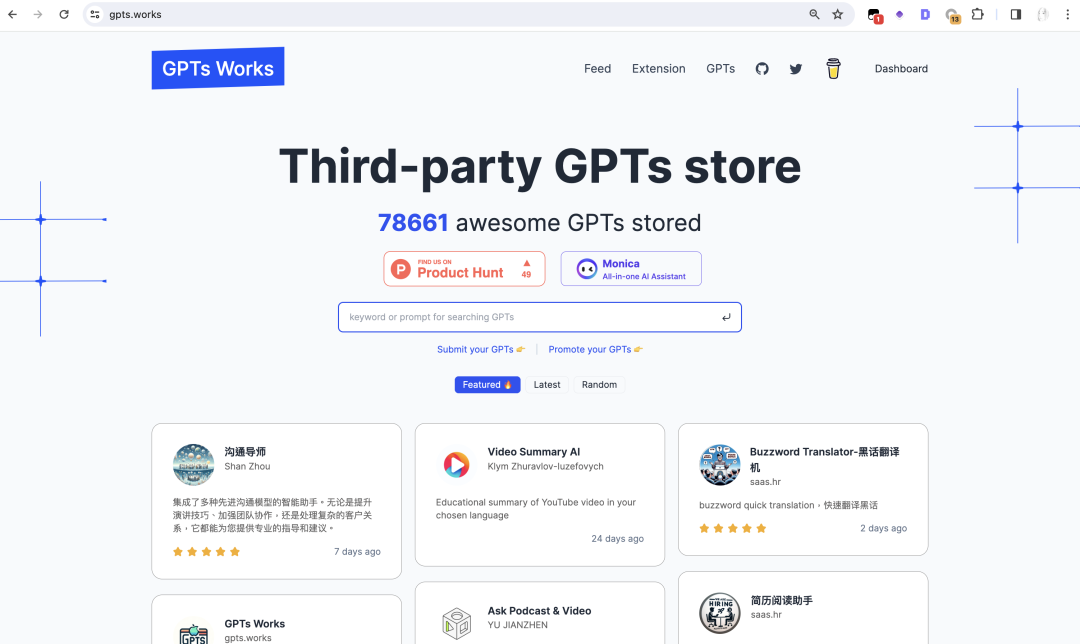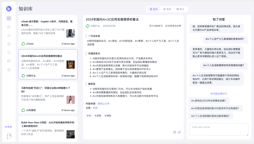 总结与感悟总结 2023 年我做过的这些 AI 项目,有一些遗憾,更多的是收获。虽然没赚到什么钱,但是在折腾这几个项目的过程中,学会了很多新技能,比如👇在实现模拟登录 SDK 的过程中,学会了跟风控策略对抗,积累了充分的爬虫经验;在做群聊总结的过程中,学会了 RPA(Robotic Process Automation 机器人流程自动化),以后能熟练的使用微信机器人了;在做 GPTalk 项目过程中,学会了用 tauri 开发跨平台桌面客户端;在做 知了 zKnown 项目过程中,学会了用无头浏览器抓网页内容,学会了用 canvas 画好看的文字图片,了解了向量数据库和向量相似度匹配,第一次用 python fastapi 做项目,学会了用 llamaindex 实现语意化检索;在做 GPTs Works 项目过程中,学会了用 nextjs 做全栈开发, 学会了用 vercel 部署项目,学会了用 plasmo 做浏览器插件开发,第一次使用 postgres 数据库替代 mysql,第一次实现 Google 登录,第一次对接 stripe 支付;然而,也有一些小遗憾👇一直在做 AI 文字生成类的产品,一直在使用 LLM 厂家的接口,没有买过 GPU 服务器,没有自己跑过模型;对 AI 画图领域不怎么了解,对 Stable Diffusion / SDXL / Lora 等技术不熟悉,Midjourney 也只是简单的用过,连 API 都没折腾过;对一些重量级产品 Runway / HeyGen / Suno / Pika 了解太少,对新事物的商业敏感度不够;我最大的优势是具备全栈开发能力,擅长应用层产品的开发与快速落地。不足之处是不懂算法,做不了大模型层面的事情。最大的短板是不懂或者说不太愿意搞营销推广,大部分时间处在闭门造车的状态。1024,我从腾讯裸辞了,现在是非常自由的状态,有时候想太多了,也会焦虑和迷茫。2024 年,我希望能持续拥抱 AI,做出更多的 AI-Native 产品。All in AI,未来可期。我的 AI 项目资料chatgpt-webapi SDK: https://github.com/all-in-aigc/chatgpt-webapiopenai-go SDK: https://github.com/all-in-aigc/openai-goclaude-webapi SDK: https://github.com/all-in-aigc/claude-webapiGPTalk 官网:https://gptalk.one/知了 zKnown 官网:https://readknown.cn/GPTs Works 官网:https://gpts.works/