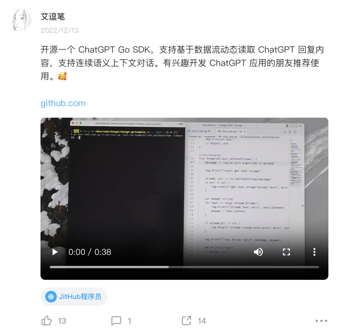 sms-activate 可以提供虚拟手机号接收短信服务,我就用这个产品解决了 ChatGPT 手机号验证的问题,顺利注册上了第一个 ChatGPT 账号,开始了我的 AI 探索之旅。我的第一个 AI 开源 SDK有了 ChatGPT 账号之后,登录 ChatGPT 网页端体验了几次,感受到了神奇。之前遇到问题都是 Google 搜索,现在只需要在对话框输入问题就能马上得到答案,解决问题的效率有了很大的提升。我当时有个想法,能不能把这种 AI 对话的功能接入到我们习惯的微信对话框?要实现这个功能,需要有一个可以调用的对话 API,然而当时 ChatGPT 并没有开放 API。我想到了模拟登录,以前爬学校教务系统实现查成绩功能的时候经常用。我用 Chrome 控制台研究了一下 ChatGPT 的网页接口,花了几个小时,写了一个 SDK,模拟浏览器请求,调用 ChatGPT 的网页版接口。我在 Github 开源了这个 SDK:https://github.com/all-in-aigc/chatgpt-webapi,当时取名叫 chatgpt-go,后来改名成了 chatgpt-webapi这个 SDK 的使用非常简单,只需要拿到 ChatGPT 登录后的 Cookie,即可实现模拟请求:token := `copy-from-cookies`