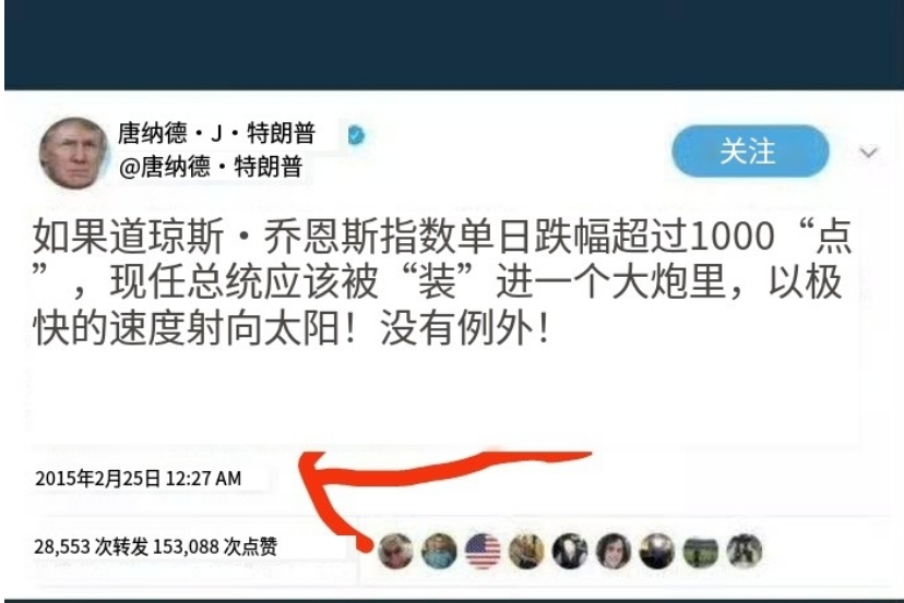 有人翻出早在2015年2月25日在推特上的言论,说如果道指单日跌幅超过1000点,美国总统应该被装进一个大炮里射向太阳,没有例外。但现在美国道指单日下跌超过1600多点了,特朗普回应道:这是可预料的,我们早已病入膏肓,我们继承了很糟糕的经济。那就是说责任应该拜登来负,被射上太阳的应该是拜登。