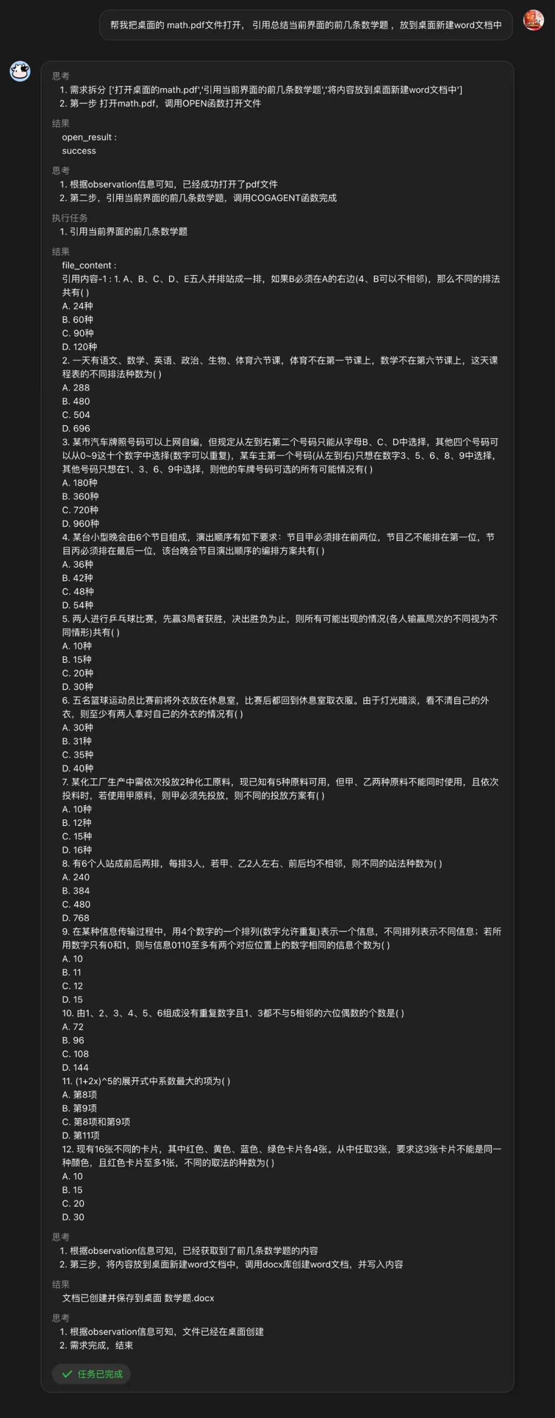实例展示:PDF数学题提取与整理流程 GLM-PC可以自动打开PDF文件,提取指定内容,并将信息整理存储到Word文档中。 操作指令:帮我把桌面的 排列组合与二项式定理练习.pdf文件打开, 引用总结当前界面的前几条数学题 ,放到桌面新建word文档中 合作我们正与联想、华硕等知名 PC 厂商展开深度合作探讨,共同推动AIPC(AI个人电脑)的创新与发展。